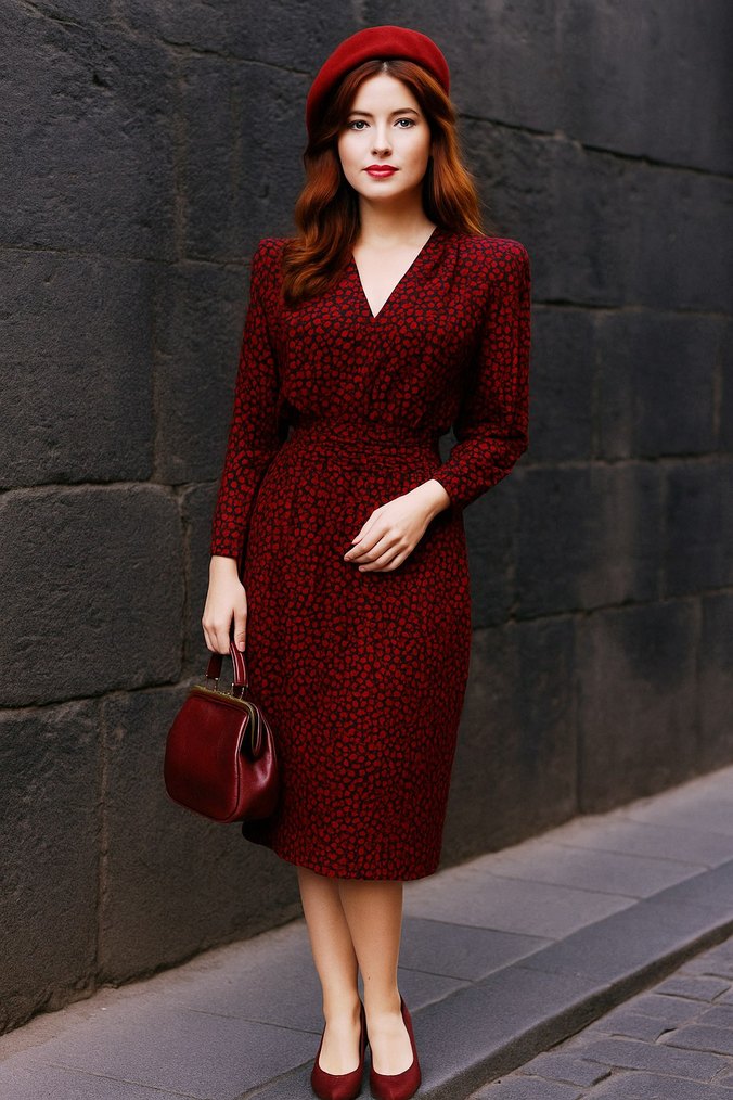 V yaka ve uzun kollu, bordo leopar desenli kemerli midi elbise. Ofis için uygun, retro sokak stili etkisiyle klasik şıklık sunar.