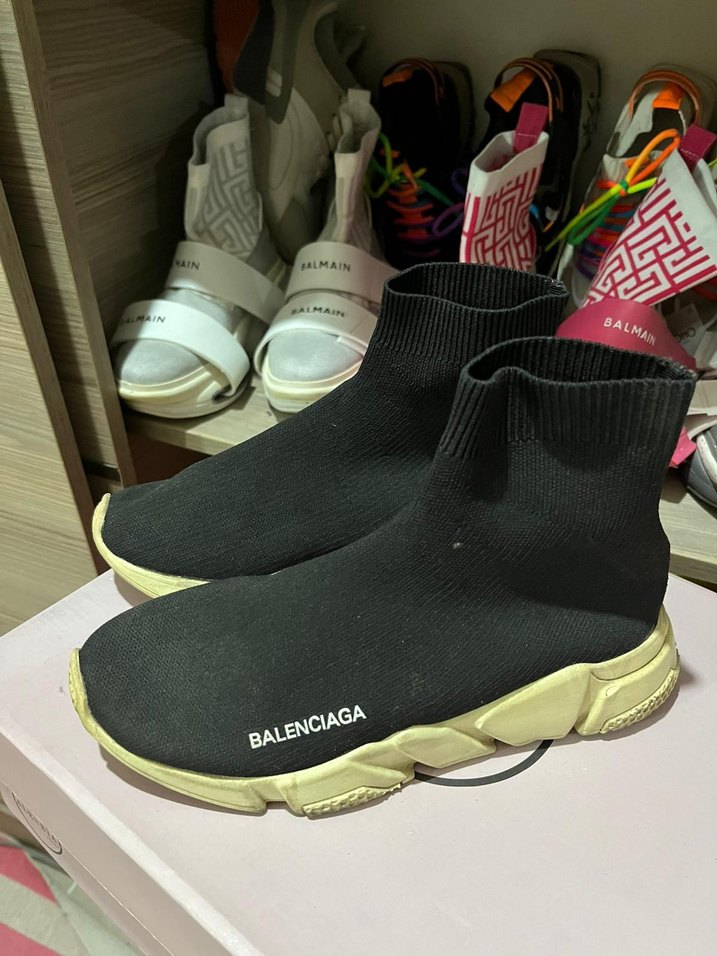 Siyah Balenciaga spor ayakkabı, elastik üst kısmı ve stiletto topuklu tasarımıyla trend bir sokak stili sunar. Kauçuk taban spor aktivitelerinde rahatlık sağlar. ürün epey kullanıldı ultra rahat olduğundan fakat deformesi yok az taban sararmasi var fiyata yansıtıyorum