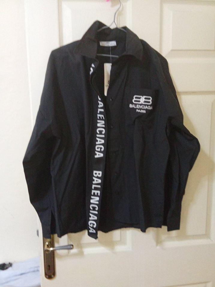Balenciaga marka siyah, uzun kollu kadin gömlek. Sentetik kumaştan, bol kesim ve yakalı. Baskılı detaylarla sokak modasına uygun.süper fiyat
