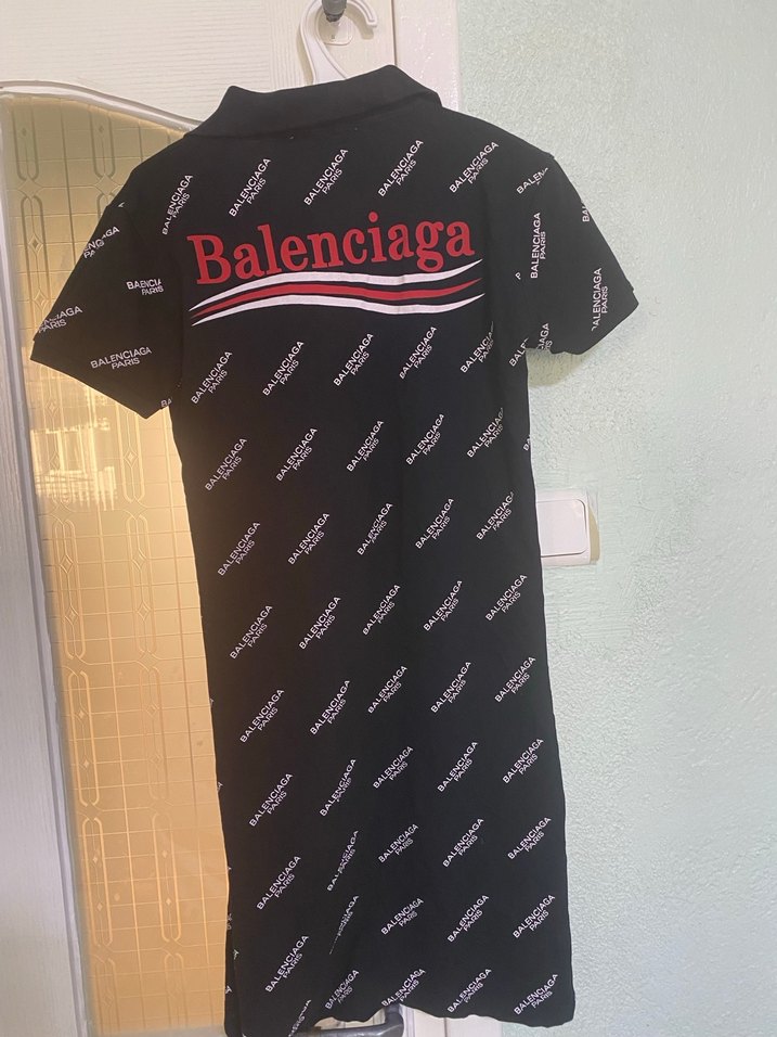 Kısa kollu, bisiklet yaka, baskılı Balenciaga desenli siyah bayan elbisesi. Tokalı detay ve midi boy ile şık ve rahat bir seçenek sunar.