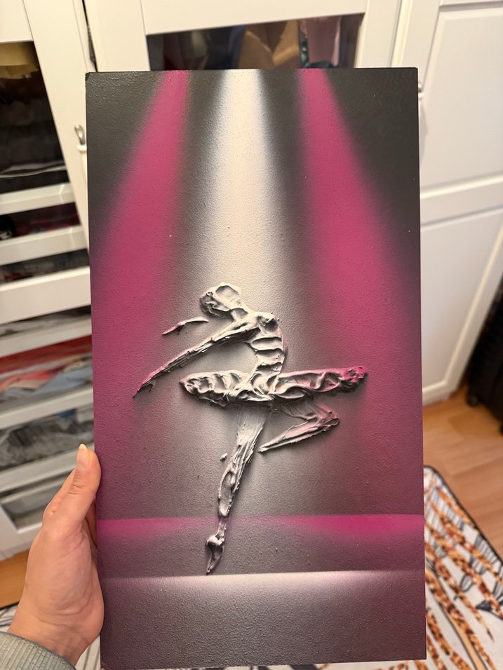 Viyana’da sokak sanatçısından satın aldım. Pembe parlak ışıklarla vurgulanmış, dokulu bir balerinin dans anını gösteren tablo. 22x40 cm boyutlarında ve ince. Ağır değil çift taraflı bant ile asılabilir.