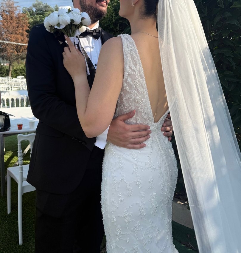 Kalın askılı sırtı beline kadar açık balık model gelinliktir fotoğrafları mevcut. Komple el emeğiyle işlenmiş taşlardan oluşur. Duvak 3 metredir gelinliğin kuyruğu da o kadar vardır. 173 boy 65 kilo bel 67 basen 97 cm olarak dikildi. 10 cm platform topukla giydim. Çok rahat herkes bayıldı. Kuru temizleme yapılabiliyor. kuyruğu uzun olduğu için altları hep tozlandı kuru temizleme alana AİTTİR.