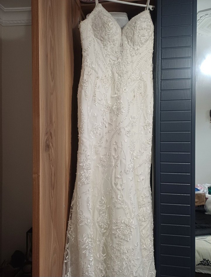 Askılı kollu, straplez yaka ve midi boyda, beyaz bohem tarzda, ince işlemeli ve hafif kumaşlı dar kesim gelinlik.