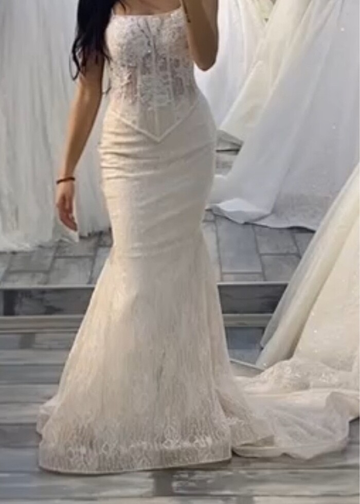 Sadece bir kez giydim. Gelinlik marka bir mağazadan alındı. Fransız dantel eteği ve üstündeki işlemesi. Kuyruklu. Askısını sonradan eklettim isteğe göre straplez kullanılabilir. 2025 YENİ KREASYONUNDAN Kol detayı ekleyip çıkartılabiliyor ben hepsini gelinlikle birlikte göndereceğim. Not: herhangi bir deformesi yok sadece kuyruk kısmı temizlenmesi için kuru temizlemeye gönderilmelidir.