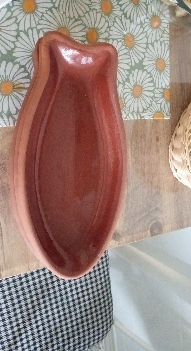 Koyu bej renkte, pürüzsüz yüzeyli seramik yemek kabı. Uzun ve özel şekliyle yemek sunumu veya saklama için uygundur. ️