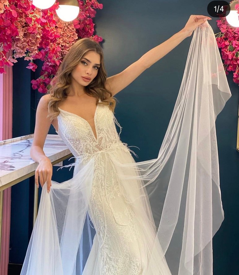 Aysira marka gelinlik.Nikahta birkaç saatliğine giyilmiştir.etek kısmındaki tozdan dolayı kuru temizleme ihtiyacı vardır.herhangibir kusuru yoktur.tarlatan ve duvak içindedir.belinde fotoğraf çekimi için kullanılabilen takılıp çıkarılabilen ayrı bir tül mevcuttur