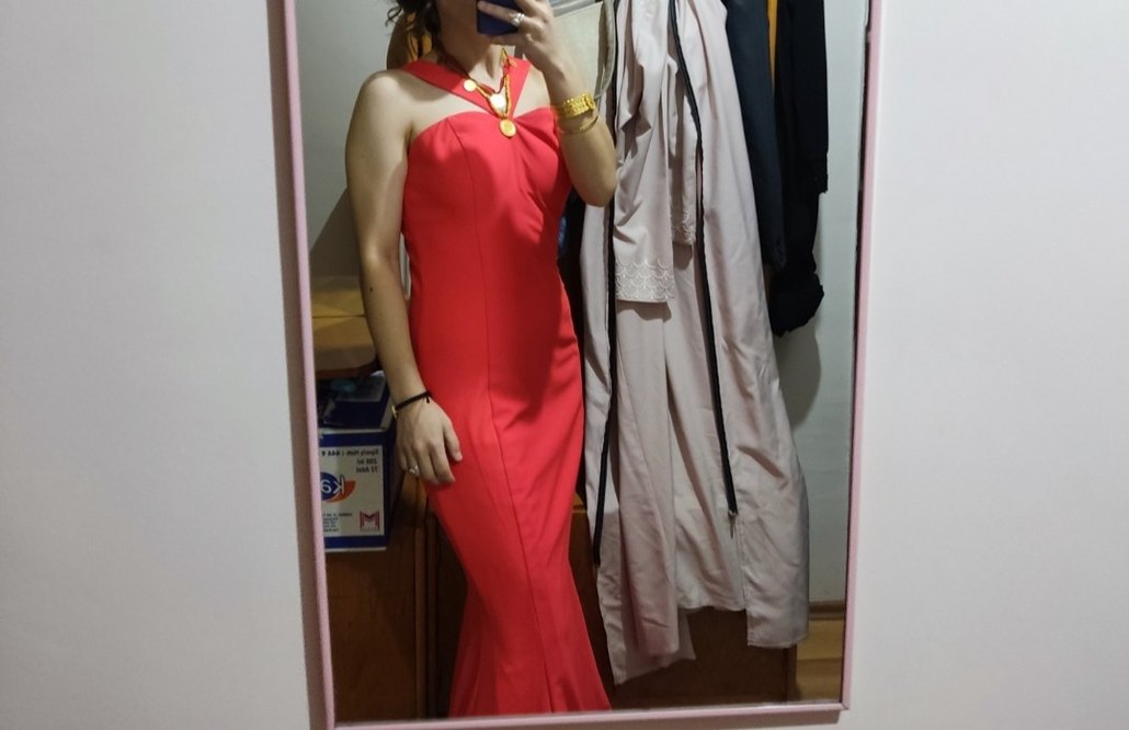 Nar çiçeği tonlarında , V yaka ve aski tasarımıyla vücuda oturur. Balik model . 160 , 50-55 kilo arasindaydim giydigimde. Fotoğrafda görüldüğü gibi a kuyruğu var. Herhangi bir sorunu yoktur .