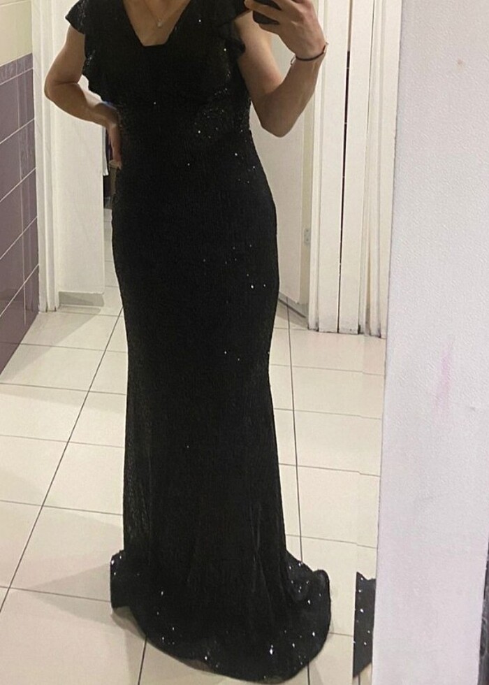 #abiyefon marka payet elbise. Üründe tadilat yoktur, 5 saat kullanılmıştır. Kuru temizleme yapılmadı. İki göğüs arası içten siyah tül ile kapatılmıştır, çıkartıp kullanabilirsiniz.