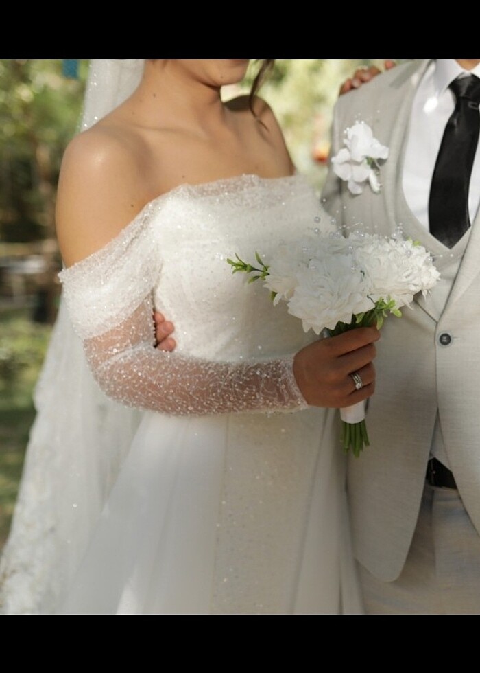 Balık model gelinlik demonte kuyruğu vardır, demontesinin arkasında düğme vardır bir düğme eksiktir ancak görünmemektedir. Gelinliğin birkaç kısmında küçük tadilatla halledilebilecek deformeler vardır. Fotoğrafta göründüğü gibidir. 163 52 kilo ile giyilmiştir. 3 mt den kısa duvağı vardır ekstra iki duvak daha var ve tüm duvaklar gönderilecektir. Kuru temizlemesi yapılmamıştır ve fiyata yansıtılmıştır. Özel dikim