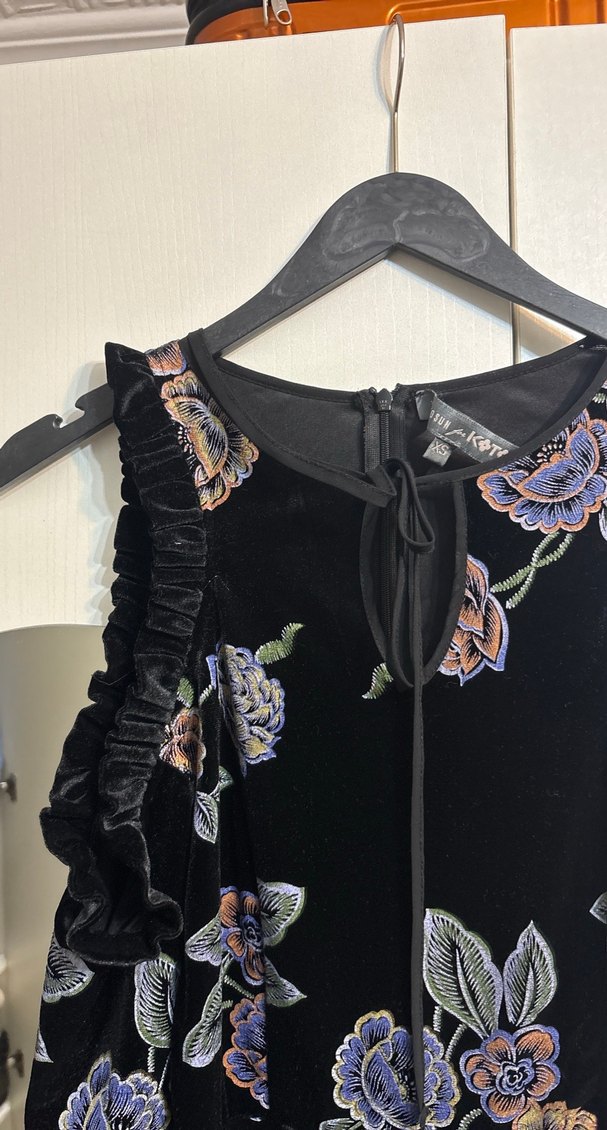 Kadife omuz detayları çok zarif bir elbise, arkadaşımın düğününde giydim tekrar giymeyeceğim için koyuyorum likralı kumaş xs,s bedene olur. 1 kere giyildi