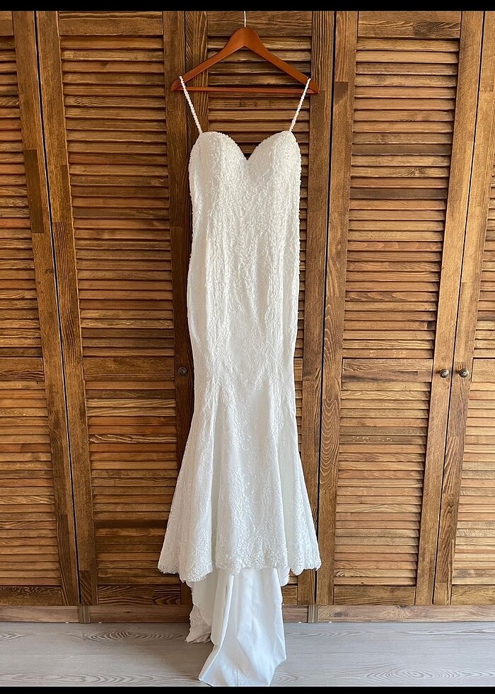 Balık model özel dikim gelinlik. 1.59 boy 54 kiloda 15 cm topuklu ile yalnızca 1 saat giyilmiştir. Kuru temizlemesi yapılıp gamboçta muhafaza edilmektedir. Fakat eteğin 2 küçük yerinde beklemekten kaynaklı sararmalar mevcuttur tekrar bir kuru temizleme yapılması gerekir. Bu durumu göz önünde bulundurarak fiyat verdim. Biri taşlı orta boy diğeri taşsız uzun iki adet duvak mevcuttur. Ürün gamboç içerisinde koliyle paketlenerek gönderilecektir. Alan kişiye şans getirmesi dileğiyle