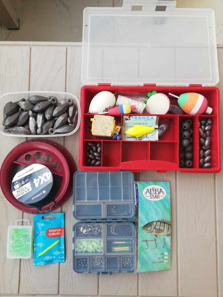 Kırmızı çok bölmeli kutuda ağırlıklar, şamandıralar, oltalar ve ALBA etiketli misina dahil çeşitli balıkçılık malzemeleri bulunur.