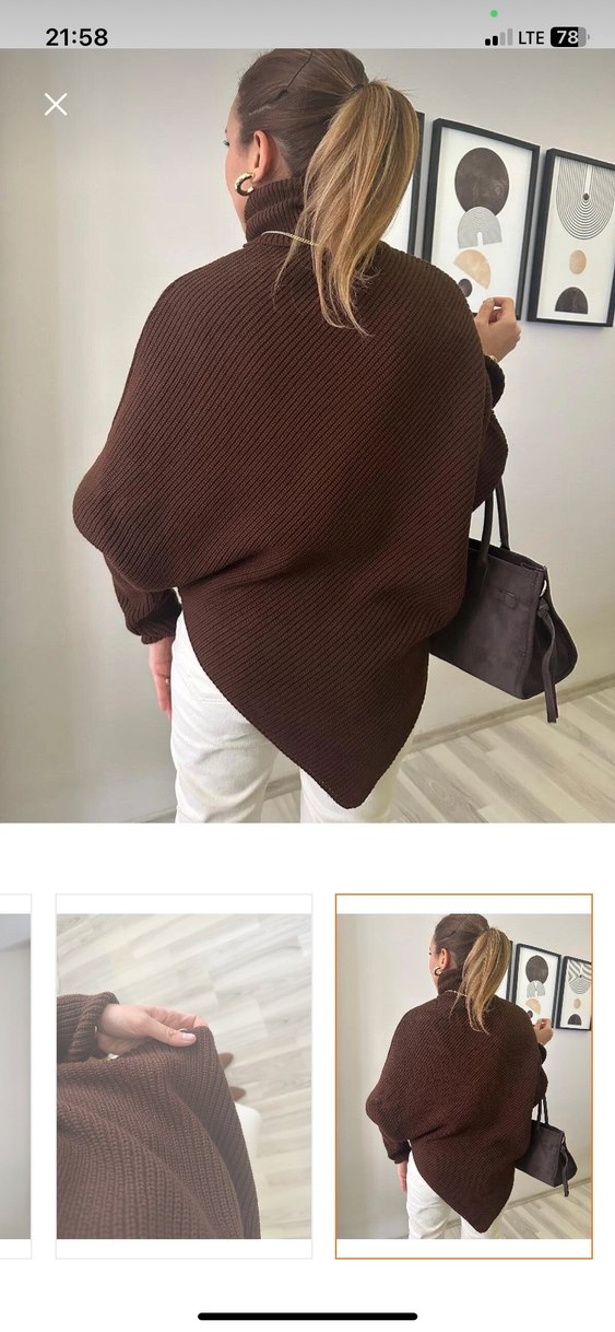 Kahve renkli Balıkçı yaka triko yarasa kol panço şık ve rahattır.