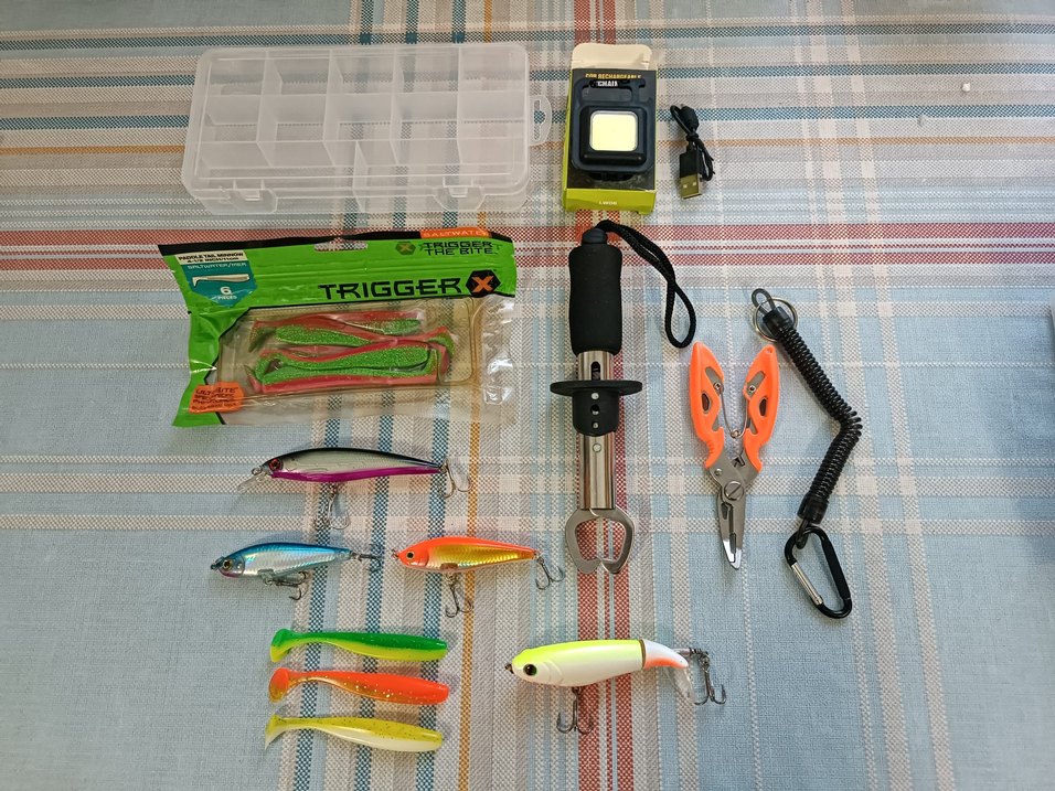 Hepsi sıfır ürünlerdir. 1 adet çok amaçlı kutu 1 adet mıknatıslı mini LED fener 1 Paket Trigger X full UV Silikon Balık 1 adet 11,5 cm 13 gram Rapala 2 Adet 7,5 cm 6 gram su üstü rapala 1 Adet Limon renk döner kuyruk rapala 3 Adet 8,5 cm Silikon Balık 1 Adet Gripper Balık tutucu 1 Adet Balıkçı pensesi ve uzatma aparatı