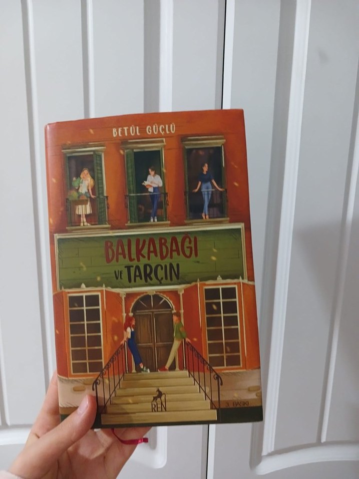 Betül Güçlü'nün "Balkabağı ve Tarçın" kitabı, binanın balkonlarında ve merdivenlerinde insanlar bulunan renkli bir kapak tasarımına sahiptir.