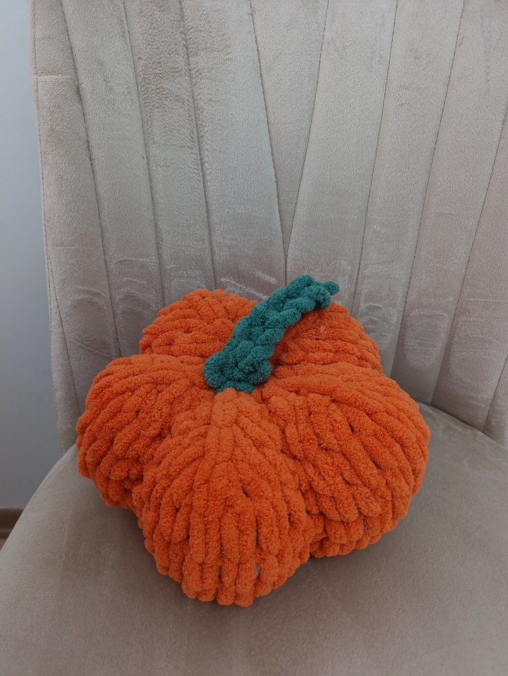 Turuncu renkli, yumuşak dokulu ve yeşil detaylı balkabağı yastık. Evinizi süsleyecek tatlı bal kabağı .