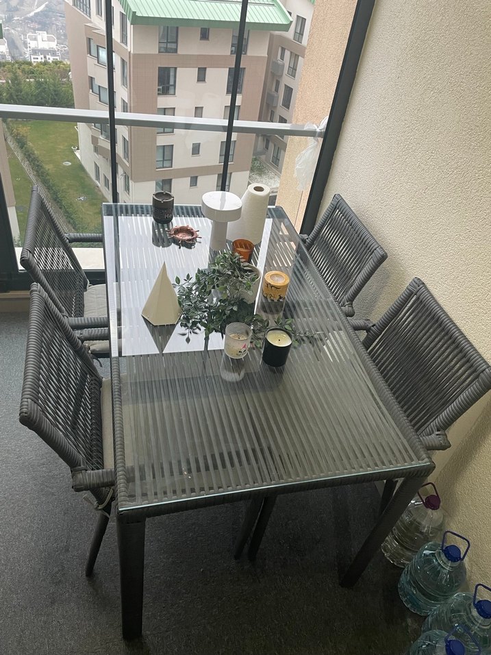 Plastik örgü masa ve dört adet sandalye, metal gövde, üzeri camlı, sağlam ve hasarsız. Bir adet minder farklıdır. Yer İlkbahar mahallesi Sinpaş Altınoran.