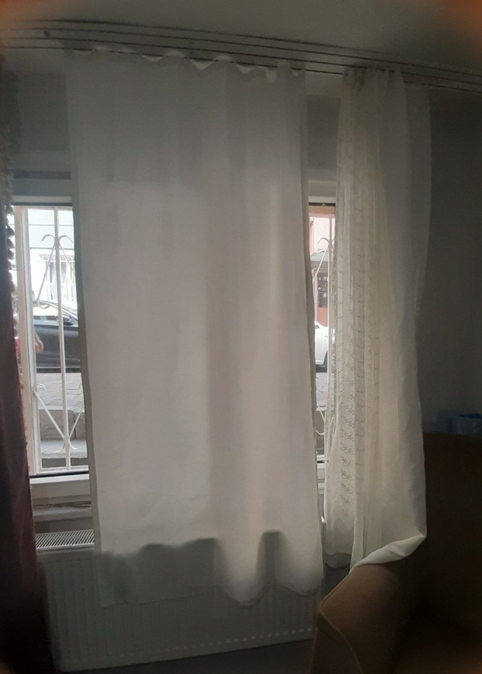 geniş olan perdemi balkon kapısına göre kesip ,kendi makinamla dikmistim. resimde paylaştım dikiş hatası var ,birde küçük lekesi var. tül perdeyide kendim ayarlayıp dikmistim ,tülu yanında hediye gondericem , güneşlik boyu 195 cm