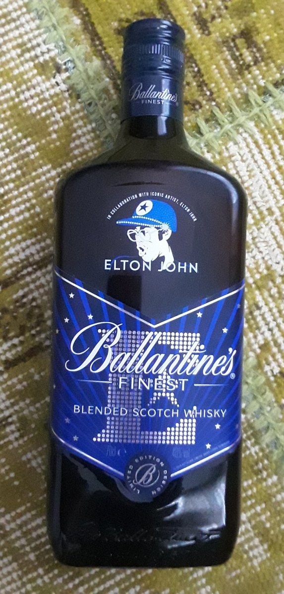 Elton John iş birliğiyle tasarlanmış mavi etiketli Ballantine's Finest Blended Scotch Whisky şişesi. Koyu renkli ve detaylı marka işaretleri bulunur.