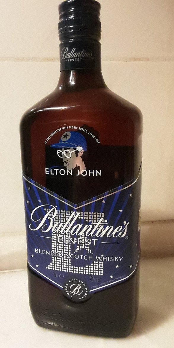 Ballantine's Finest karışık İskoç viskisi, Elton John çizimli mavi vintage etiketli parlak şişede. Koleksiyonluk özel ürün.