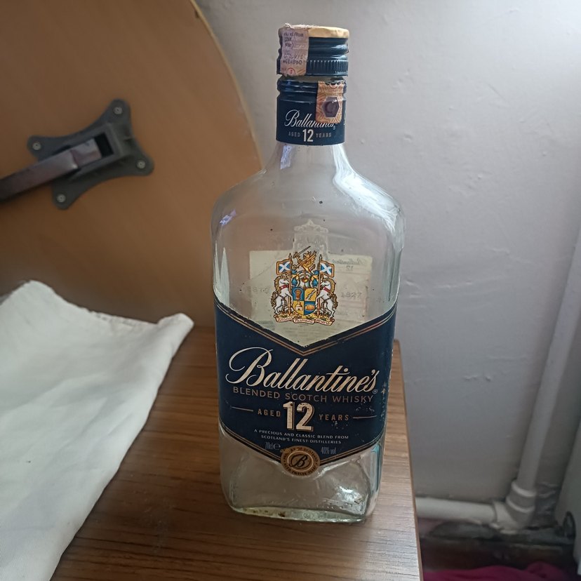 Boş şişedir Ballantine's 12 yıllık karışık İskoç viskisi, vintage tarzında koyu mavi etiketli beyaz şişede. Şişe kullanılmıştır.