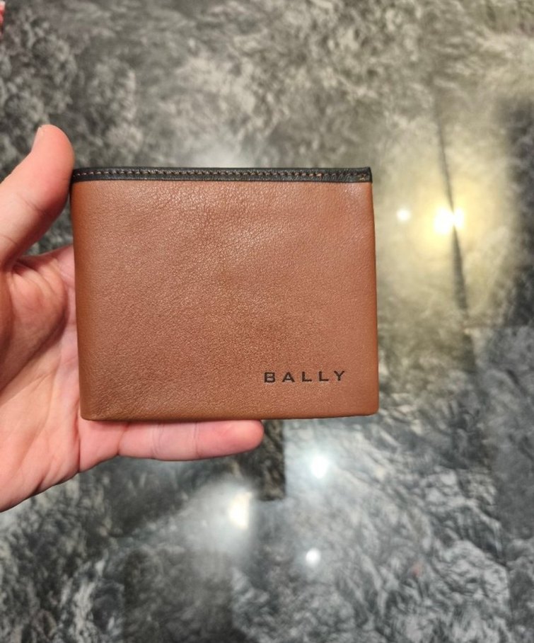 Bally marka, bej renkli erkek cüzdanı. Minimalist ve sokak stiline uygun baskılı desene sahip.