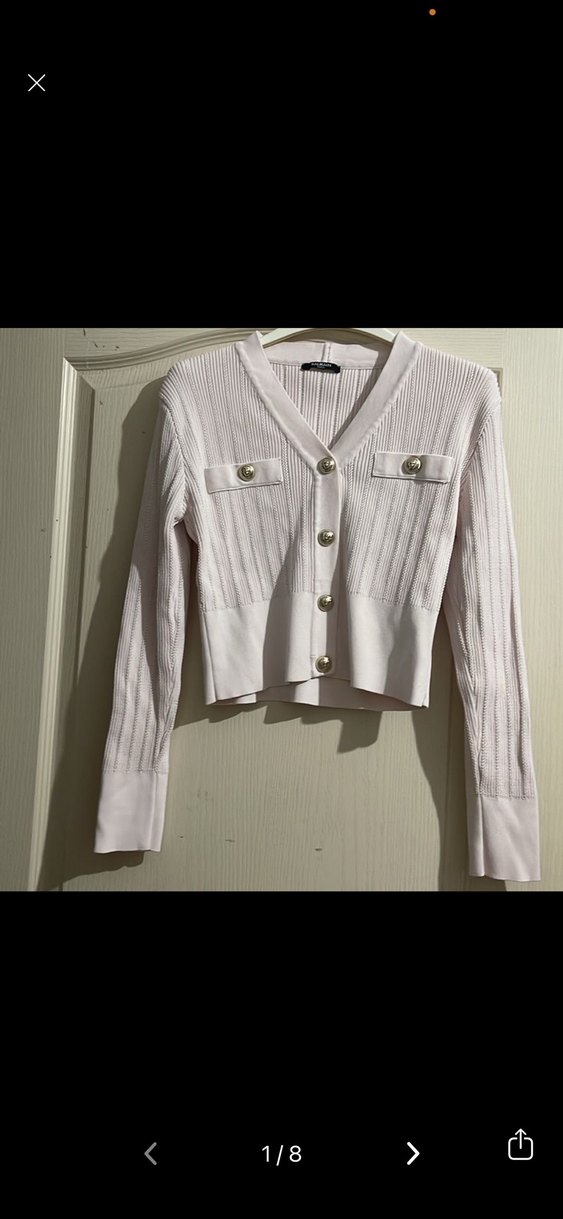 Uzun kollu, V yaka ve düğmeli pudra pembesı fitilli hırka. Pamuklu, kısa boylu ve desensiz tasarımıyla günlük sokak stiline uygun.
