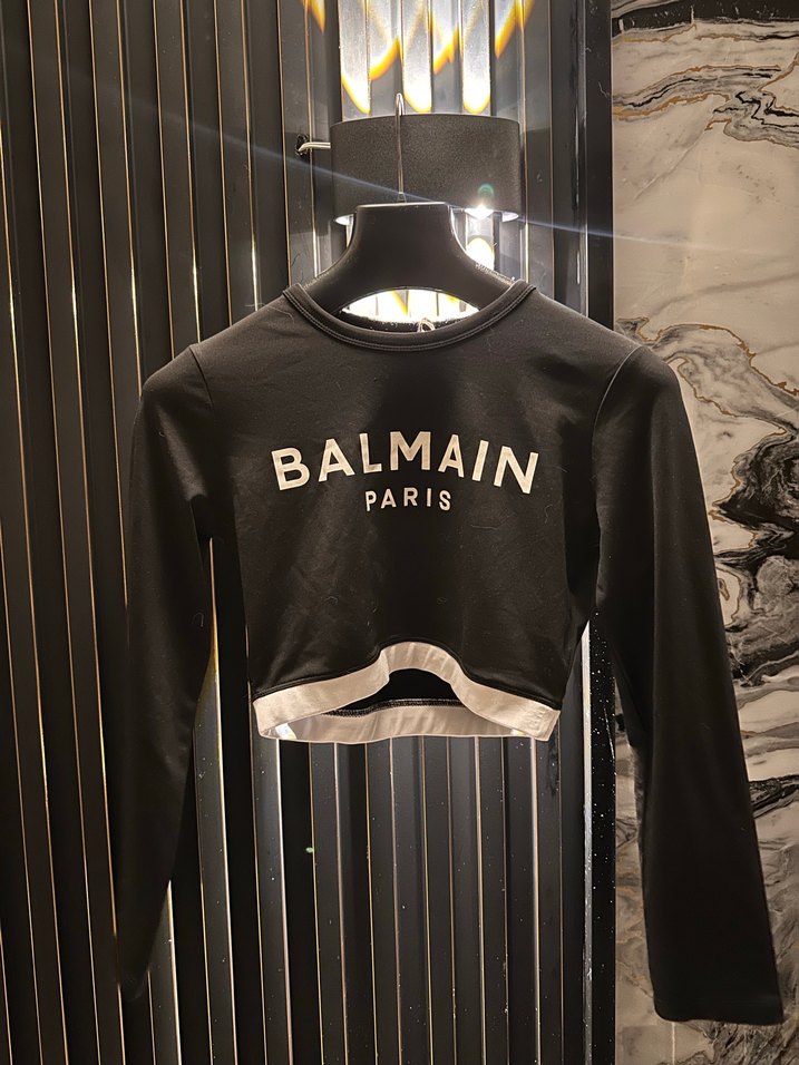 Balmain Paris kadın crop top, uzun kollu, dar kesim ve kısa mini boydadır. Siyah sentetik kumaş üzerine baskılı logo ve kemer detayına sahiptir.