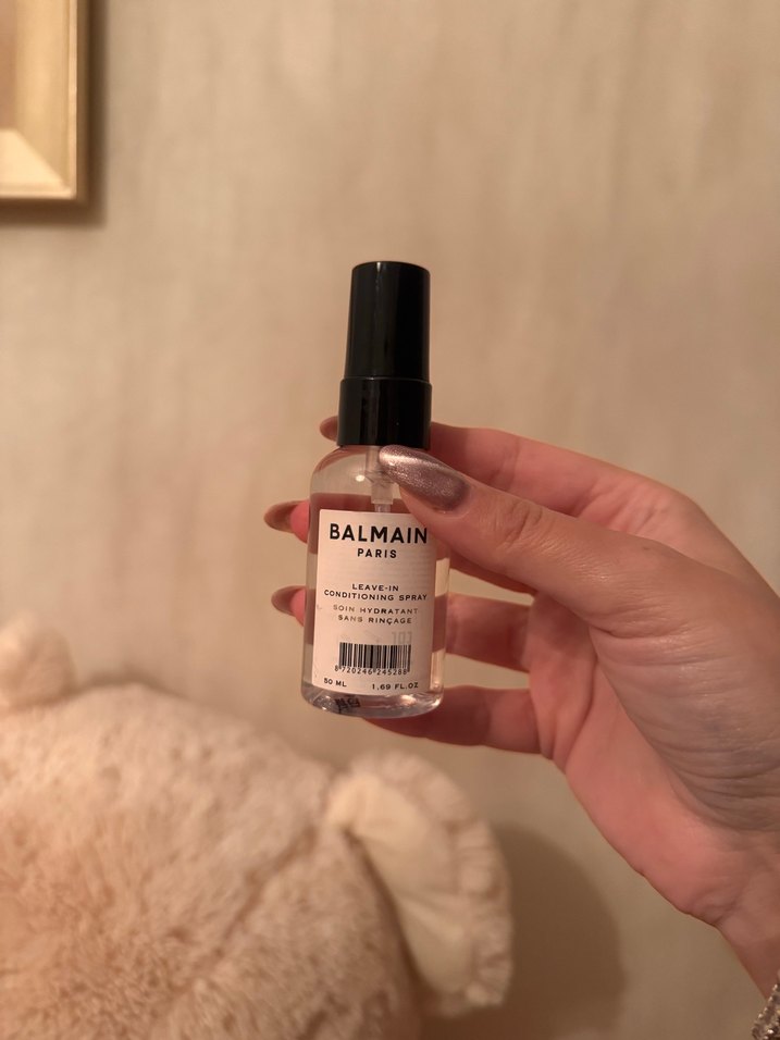 Balmain Paris markalı, parlatıcı bej renkte saç için bırakılan bakım spreyi. Siyah sprey başlığı ve şeffaf şişesi vardır.✨