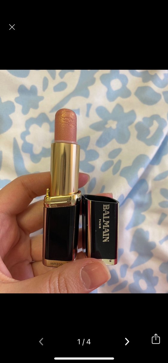 Balmain markalı, pastel bej tonunda, yumuşak dokulu ruj. Siyah ve altın renkli şık ambalaj üzerinde Balmain logosu bulunur.