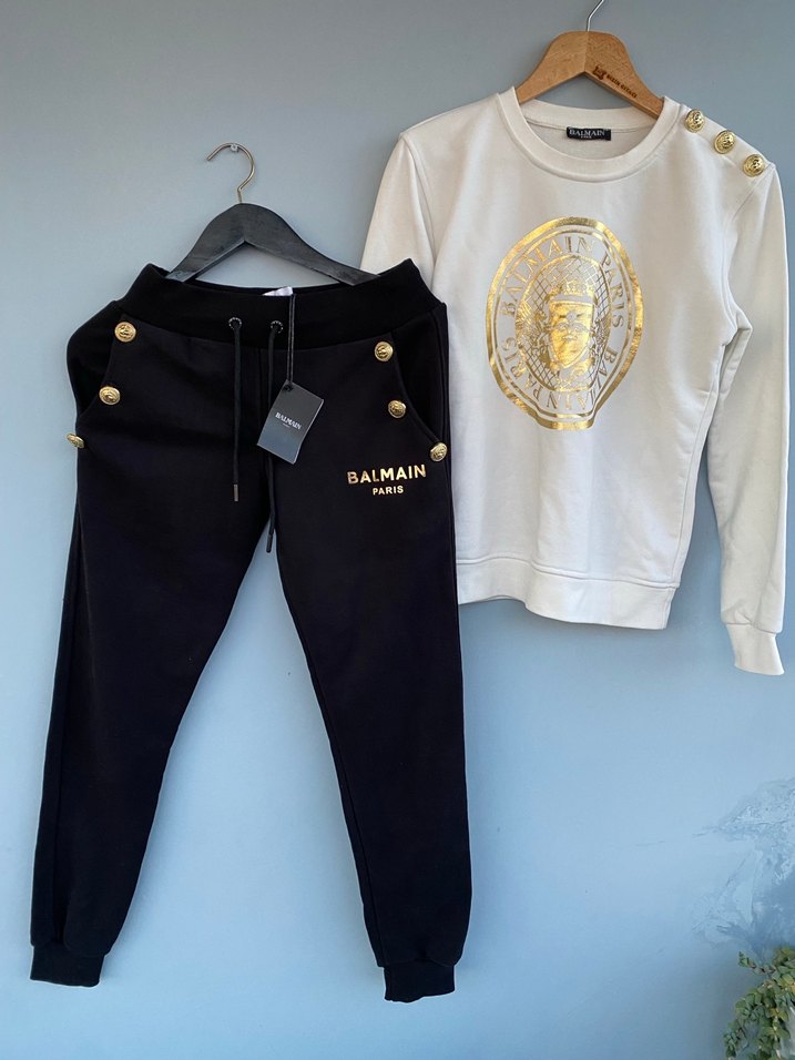 Balmain pamuklu, uzun kollu beyaz üst ve siyah, düğmeli pantolondan oluşan bol kesim takım. Altın baskılı, rahat ve şık. ✨ Etikwtli hatasız kullanılmamıstır.yurtdışından kaliteli muadildir.gokd düğmeleri çok şık duruyor,kilo aldığımdan dokayı hiç giyemedim ama çok begenerek aldım.kefil olabilecegım kalitede ve şıklıkta bir takım bu fiyata kaçırmayın♀️#balmain#gucci#prada#ysl#miu miu#versace#