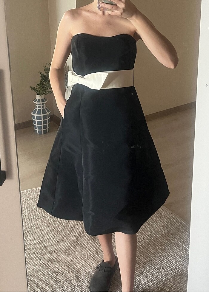 Tafta kumaştandır. Kurdeleli kemeri çıtçıtlıdır, cikarilabilir. Sadece bir kere giyilmiştir. Mango eski sezona aittir. Ceplidir. Boyu 80 cm’dir.