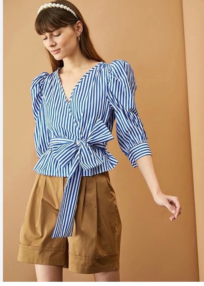 Balon kol bel detaylı üst bluz gömlek
