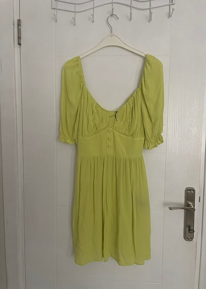 Yazlık belden oturuyor çok şık ve şirin bir elbise diz üstüdür gögüs dekoltesi var tek sorunu iç gösteriyor plaj elbisesi olarakta giyilebilir rengi fosforlu yesille sarı arası