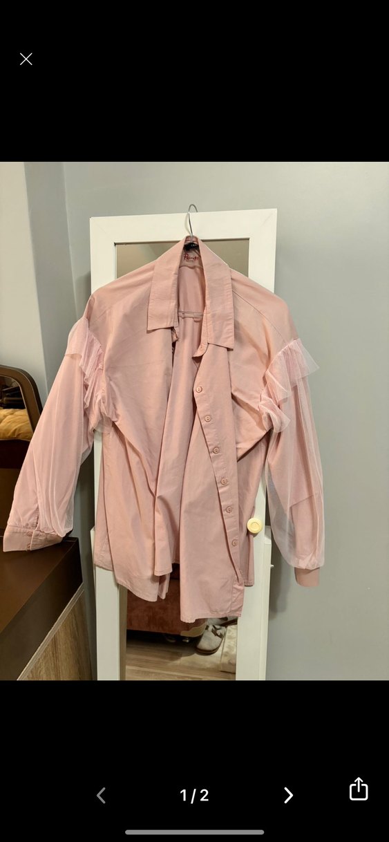 Pastel pembe keten gömlek, uzun kollu ve yakalıdır. Düğmeli ön kısmı ve midi uzunluğu ile rahat ve şık bir ofis görünümü sunar.