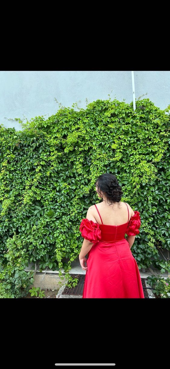 Parlak kırmızı kumaştan, V yaka ve ince askılı, drapeli uzun kadın abiyesi. Cesur ve modern tarzıyla düğünler için uygundur.