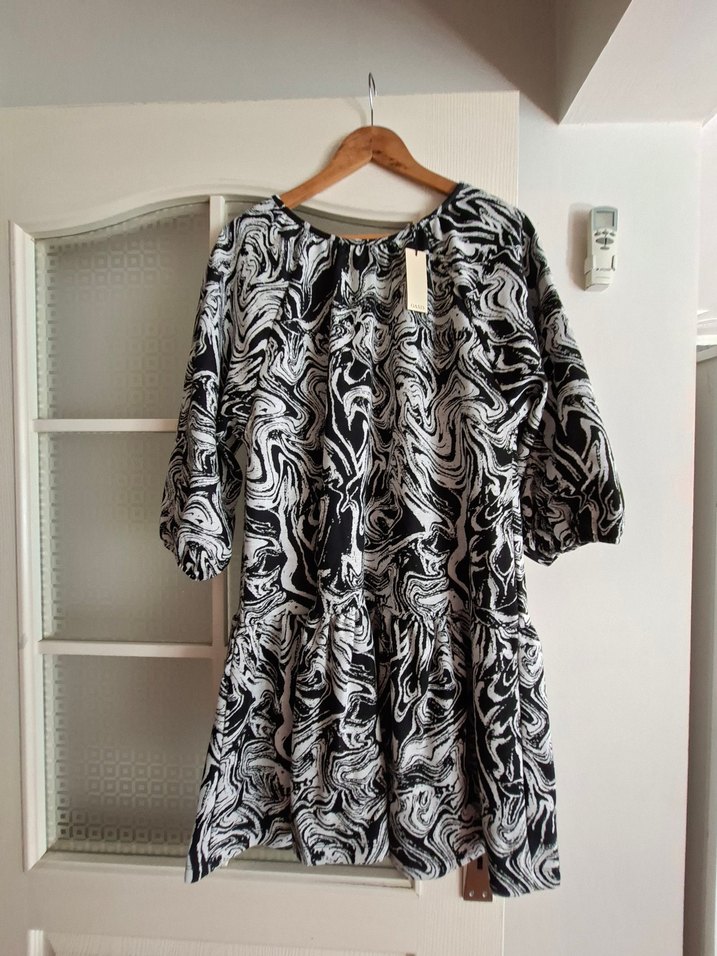 Gri zebra desenli, kısa ve bol kesim kadın elbise. Tekne yaka ve kısa kollu, yumuşak sentetik kumaştan yapılmıştır. detaylarıyla bohem tarzını yansıtır. Günlük kullanım için uygundur. ölçü görselledim kışlık tok dokulu