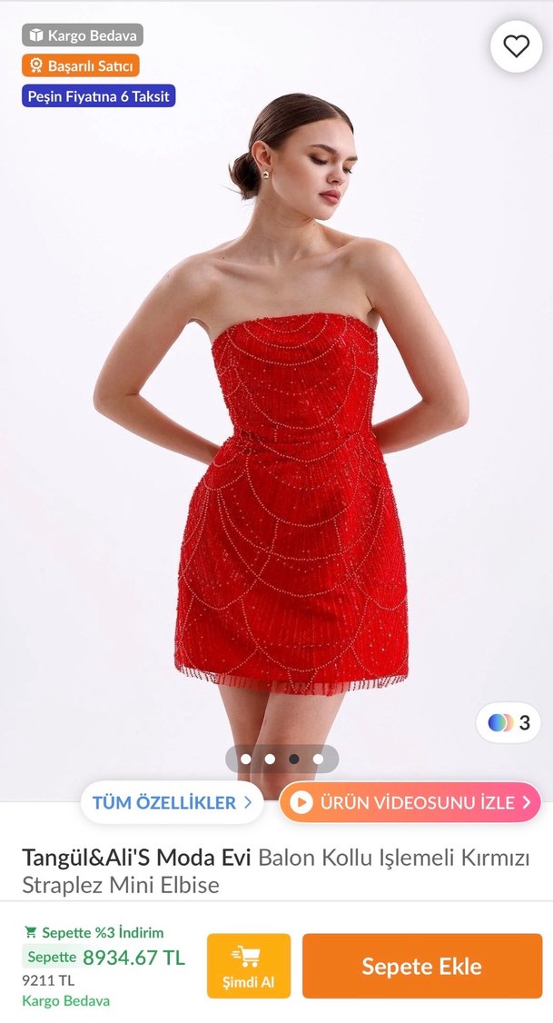 Balon Kollu İşlemeli Kırmızı Straplez Mini Elbise