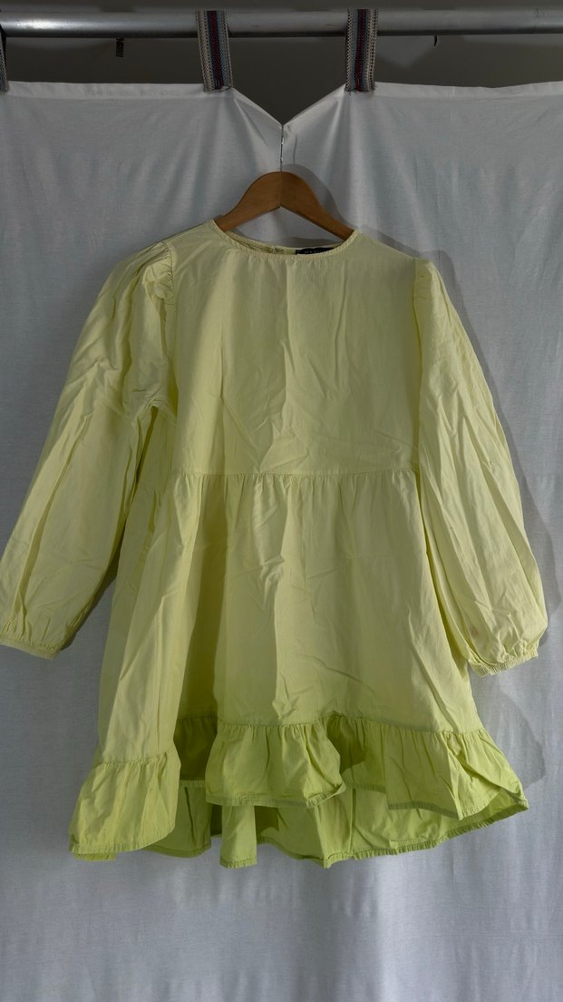 Pastel sarı renkte, etek ucu yeşil, uzun balon kollu, bol kesim kısa elbise. Fotoğrafta biraz koyu çıkmış rengi daha açık pastel bir renk normalde. Cepleri var. Yuvarlak yaka ve volan detaylarıyla bohem tarzı sunar. Mini bir elbise ben altına şortla çok rahat kullandım. Tunik olarak da kullanılabilir. Son fotoğrafta ürünün ölçülerini yazdım. Kolunda çok belli olmayan küçük bir yırtık var. Marka temsilidir. %100 pamuktur. #vintage #retro