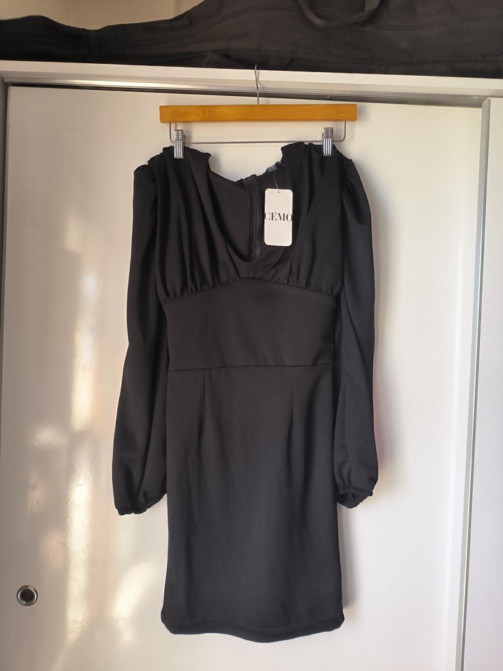 Siyah midi uzun kollu, V yaka, oturan kesim elbise. Minimalist goth tarzıyla , hiç giyilmedi etiketli, s/m beden uyumlu