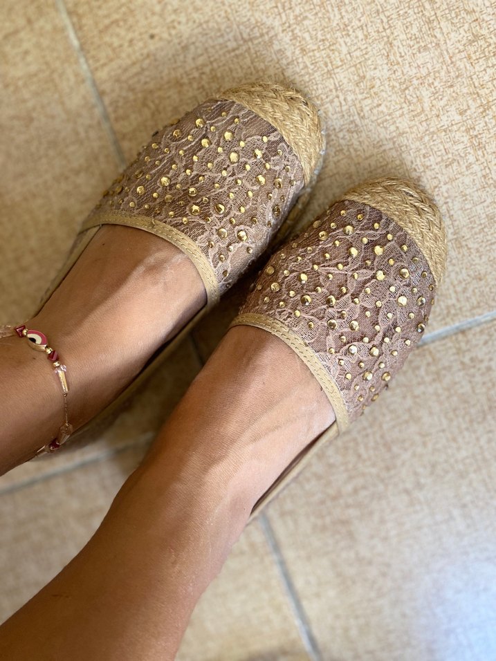 • Marka: Bambi • Numara: 37 • Renk: Ten / Gold detaylı • Üst kısım: File üzeri altın rengi taş işlemeli • Taban: Hasır görünümlü rahat espadril taban • Yazlık, hafif ve rahat kullanım • Günlük kombinlere şık bir dokunuş katar ✨ Hem rahatlığı hem de şıklığı bir arada arayanlar için ideal! Sentetik kumaştan yapılmış, boncuk işlemeli ve nakışlı bej dolgu topuklu babetler. Parlak yüzeye sahip, günlük kullanım için uygun bohem tarzda.