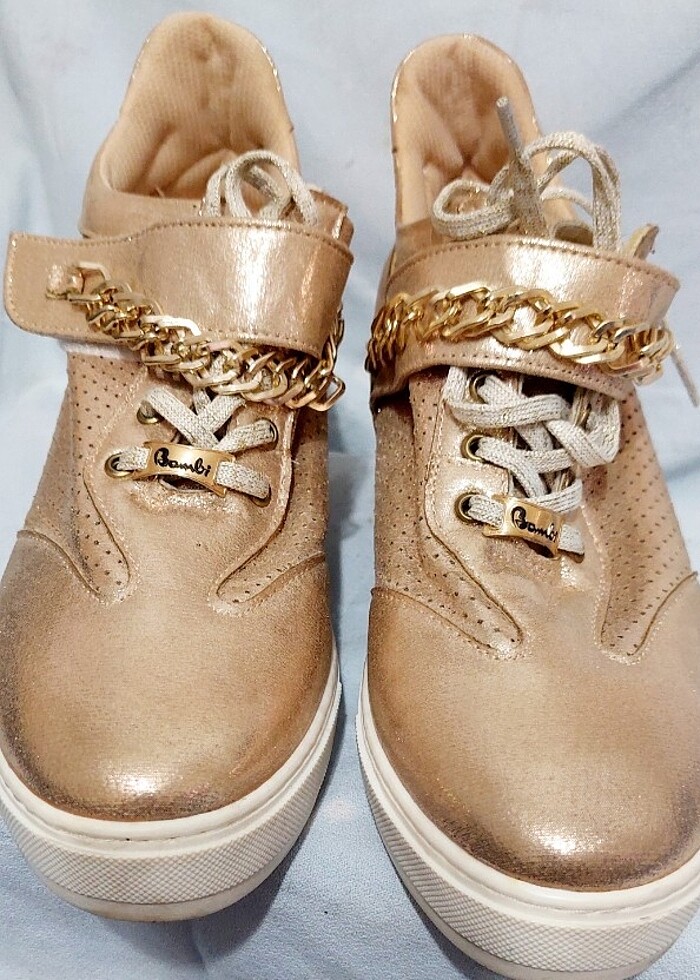 BAMBİ, ALTIN RENK KADIN BOT SAYILI GİYİLDİ. ÇOK İYİ DURUMDADIR. 40 NUMARA... KALIN TABAN 3 CM YÜKSEKLİK TABANDAN BİLEĞE YÜKSEKLİĞİ 12 CM CIRTCIRTLI VE BAĞCIKLI