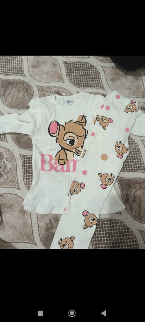 Beyaz renkte, uzun kollu ve örgü dokulu bebek kız takımı, baskılı deseni ve pastel renkleriyle yumuşak bir görünüm sunar.