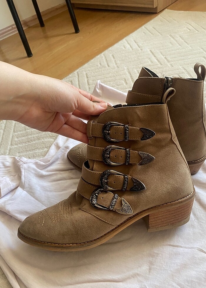 Kadın Kahverengi tokalı kısa bot. Topuk boyu 4 cmdir. Üzerinde aşınma kopma gibi bir durumu yoktur. En fazla 5 kez giyilmiştir.