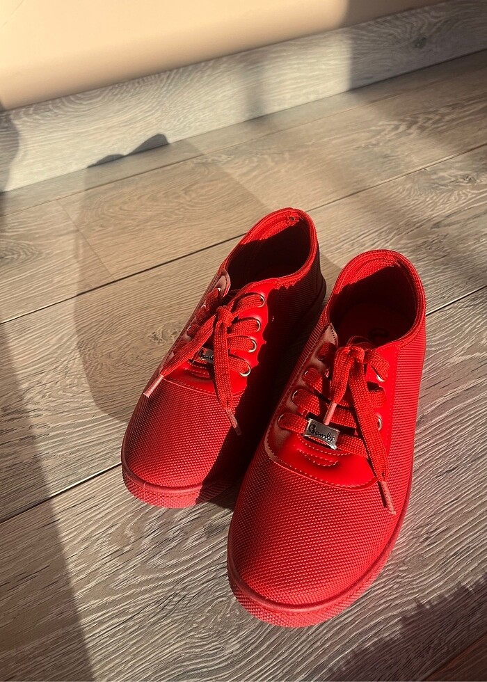 Bambi 37 numara canlı kırmızı ayakkabı. Sadece bir kere temiz zeminde kullanıldı. Defosu yoktur