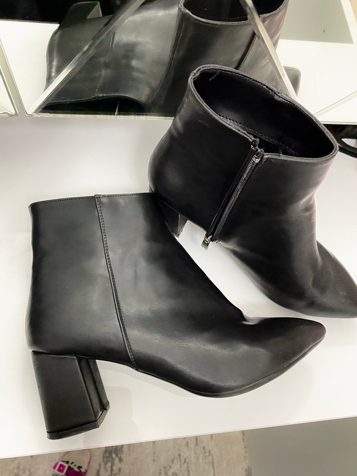 Siyah deri, tokalı ve yan fermuarlı kadın botu. Blok topuklu, minimalist goth tarzında, günlük kullanıma uygun.