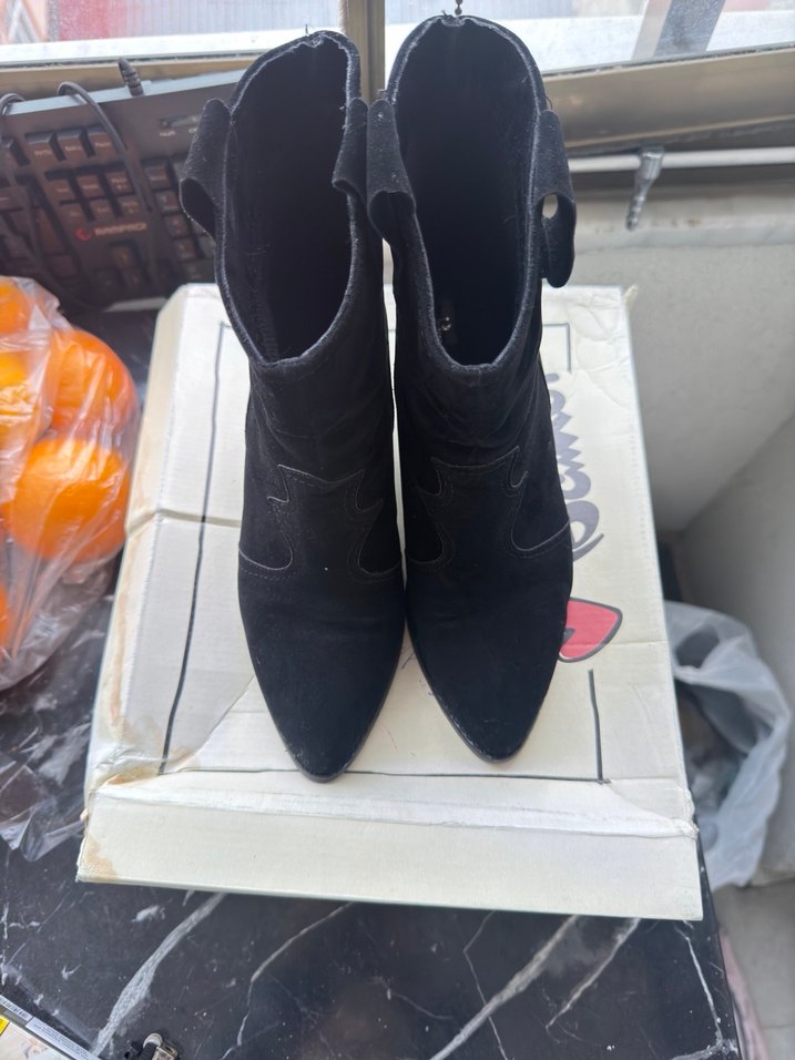 Bambi 36 numara 2 kere giyildi Siyah süet kadın botlar, dolgu topuklu ve tokalı kayışlıdır. Desensiz, trend ve gotik tarzlara uygundur.