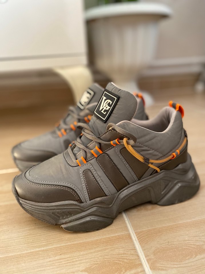 Gri yüksek topuklu, bağcıklı kadın spor ayakkabısı. Baskılı desenli ve kauçuk tabanlı, sportif sokak giyimine uygun. Defosuz temiz