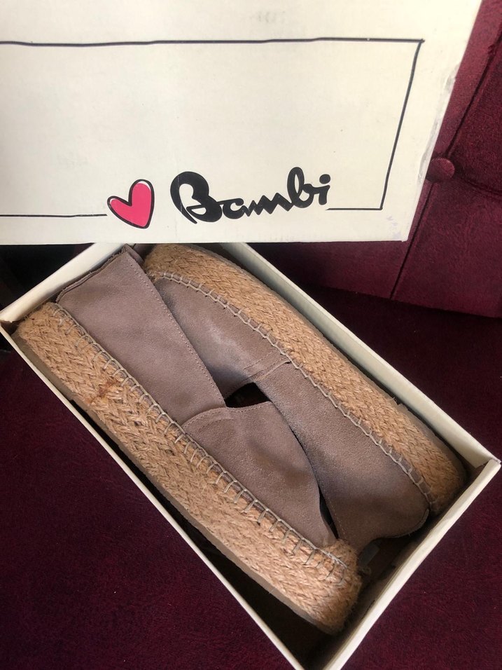 Bambi espadril. Vizon rengi, hakiki süet. kalın tabanlı. Burnu, tabanı ve altı hasır. Sadece 1 kez giyildi. Çok iyi durumda. Neredeyse yeni gibi. Saklama koşullarından ötürü hafif deformasyonu var ama içine gazete tomarları yerleştirilerek zamanla normal hale getirilebilir sanıyorum. Orijinal kutusunun içinde. İlkbahar ve yaz için günlük şık ve rahat bir seçim. ✨Ürün fotoğraflarda görüldüğü durumda gönderilir. ✨Tüm ürünlerimi dürüst ve detaylı tarif ediyorum. Kargolamadan önce ürünü tekrar kontrol ediyor, daha önce gözümden kaçıp ilanda bahsetmemiş olduğum bir husus olduğunu fark ettiğimde hemen alıcıyı bilgilendirip isterse siparişi iptal ediyorum. ✨İADE KABUL EDEMİYORUM, lütfen tüm sorularınızı satıştan önce sorunuz