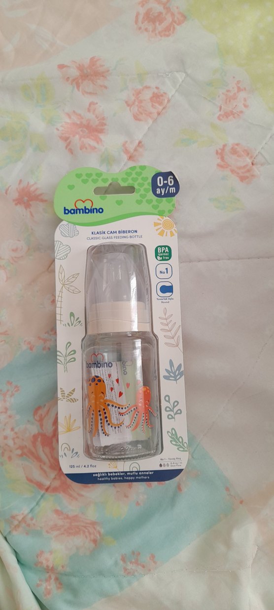 Bambino 0-6 ay cam biberon, BPA içermez, yumuşak emzikli ve 125 ml hacimli. Sağlıklı beslenme için uygundur.